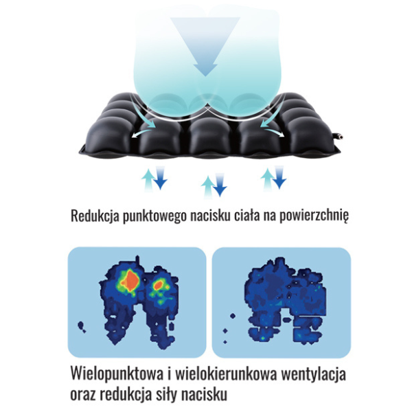 Charakterystyczna wielokomorowa konstrukcja pozwala na regulację twardości poduszki poprzez łatwe dopompowanie lub upuszczenie powietrza, dzięki czemu każdy użytkownik może dostosować ją do swoich indywidualnych potrzeb. Zastosowanie automatycznego zaworu umożliwia błyskawiczną zmianę twardości w dowolnym momencie, co dodatkowo zwiększa komfort użytkowania. Wysokiej jakości materiały, z których wykonano poduszkę, są odporne na nacisk, a niezależne komory tworzą spójny system powietrzny, co umożliwia optymalne rozkładanie ciężaru ciała. W przypadku nacisku na jedną z komór, ciśnienie w sąsiednich komorach wzrasta, co przyczynia się do odciążenia poszczególnych partii ciała, a dzięki zastosowanej technologii zgrzewania, poduszka pozostaje szczelna.