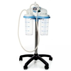 W standardowym wyposażeniu znajdują się dwa szklane (poliweglanowe) pojemniki o pojemności 2 litrów każdy, z zaworami bezpieczeństwa zapobiegającymi przepełnieniu. Dzięki dwóm butlom użytkownik może pracować niemal bez przerwy: gdy jedna butla jest pełna, drugi zbiornik natychmiast przejmuje odsysanie, dopóki nie opróżnimy pierwszego. Pojemniki są odporne na działanie wysokich temperatur i można je łatwo czyścić – w razie potrzeby można stosować środki dezynfekujące. W komplecie znajdują się też silikonowe dreniki odsysające, łączniki oraz filtr antybakteryjny. Model umożliwia także wykorzystanie wkładów jednorazowych (np. FLOVAC 1 l lub 2 l), co zwiększa higienę pracy i minimalizuje czas potrzebny na mycie pojemników.